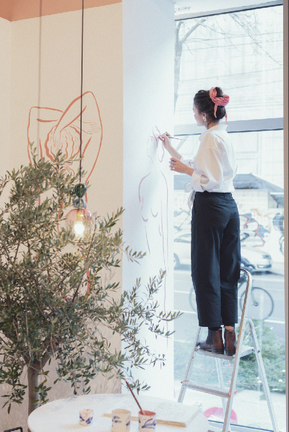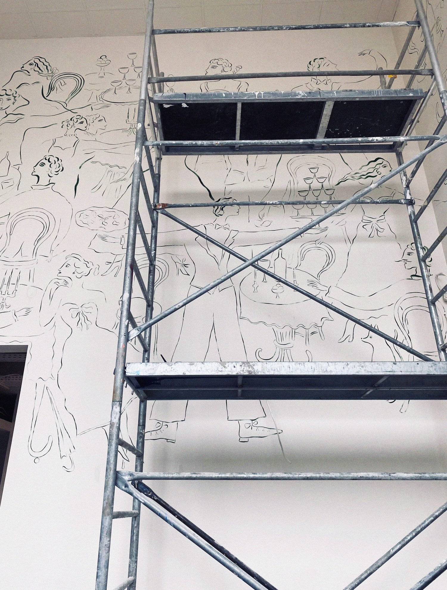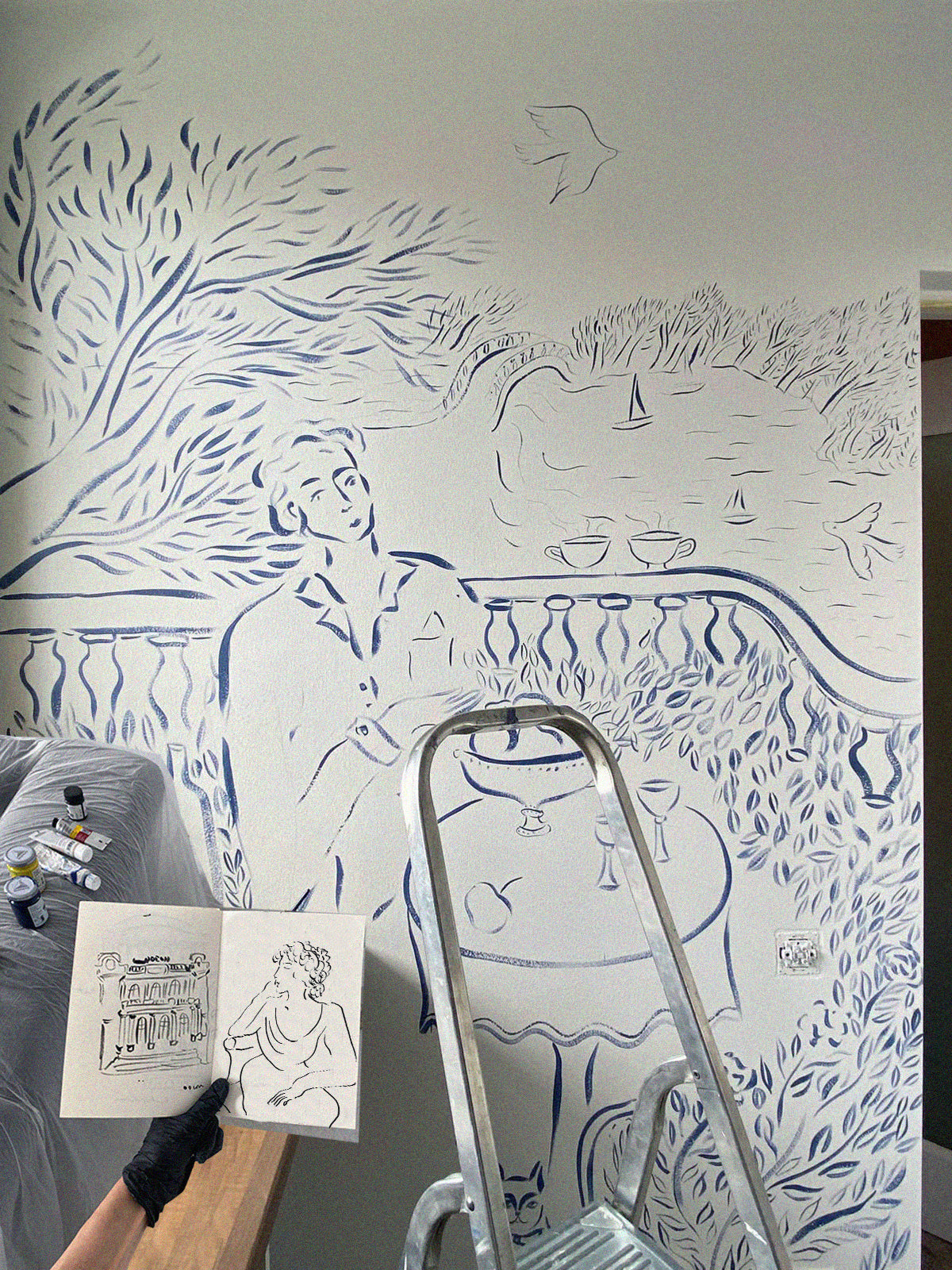 Site visit & Execution – ajustments based on light, scale, surface, and spatial context, pencil drawing & painting directly on the wall, evolving in dialogue with the space