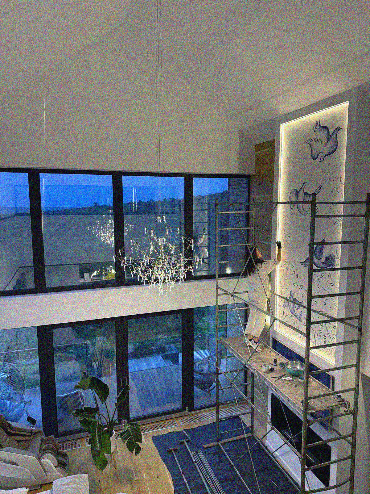 Anei îi încredințezi un proiect așa cum i-ai da în grijă un copil. Poate cu semne de întrebare și îndoieli, dar îl primești înapoi transformat, încărcat de suflet. I-am lăsat Anei în grijă sufletul casei mele: un perete alb pe care l-am tot amânat doi ani după inaugurare. L-a primit cu entuziasm și smerenie, iar împreună am construit o poveste care s-a așezat firesc în casa noastră, cu delicatețea și sensibilitatea ei unice. Nu am lucrat cu planuri exacte, am lăsat spațiul să-i vorbească. Am apreciat enorm energia și creativitatea constantă dozate de Ana în acest proiect, de la primele minute petrecute pe schelă, până spre finalul celor peste opt ore de desen.